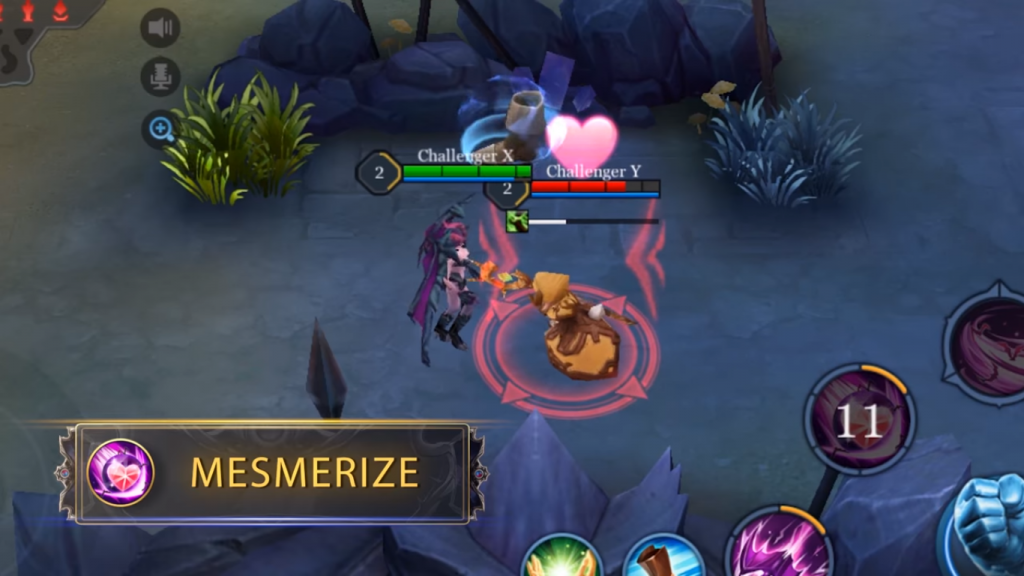 Veera will bestow a heart on her enemy who will become instantly smitten and suffer a very unfortunate love. This is Veera's only disabling skill and prioritizes enemy Heroes. Veera can use mesmerize to disable enemies when they are low on health. 1.5 seconds of stun should be enough time for Veera to slay them.