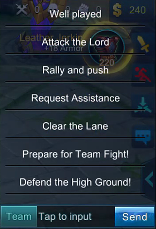 There are four buttons you can opt to use if you are not a fast typist on your tablet or mobile phone. There is attack, retreat, group up and various short phrases to communicate your point across. Below are what you can quickly say to your teammates: